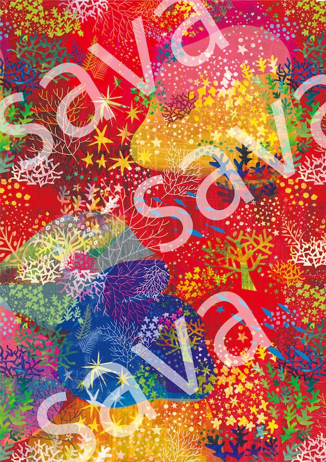 春、海、珊瑚をテーマに制作した空間デザインを そのままおうちで飾れる絵画に。 太子サイズ(287X378mm)の木製額縁に入った作品です。 ハル=春。 ウル=沖縄の言葉で珊瑚のこと。 春珊瑚は 水色と赤色の2種類。 こちらは赤色です。 制作年:2026年 デジタル作品(絵の具を取り込みIllustratorソフト上で切り絵した作品) 高性能印刷で出力、サイン付き