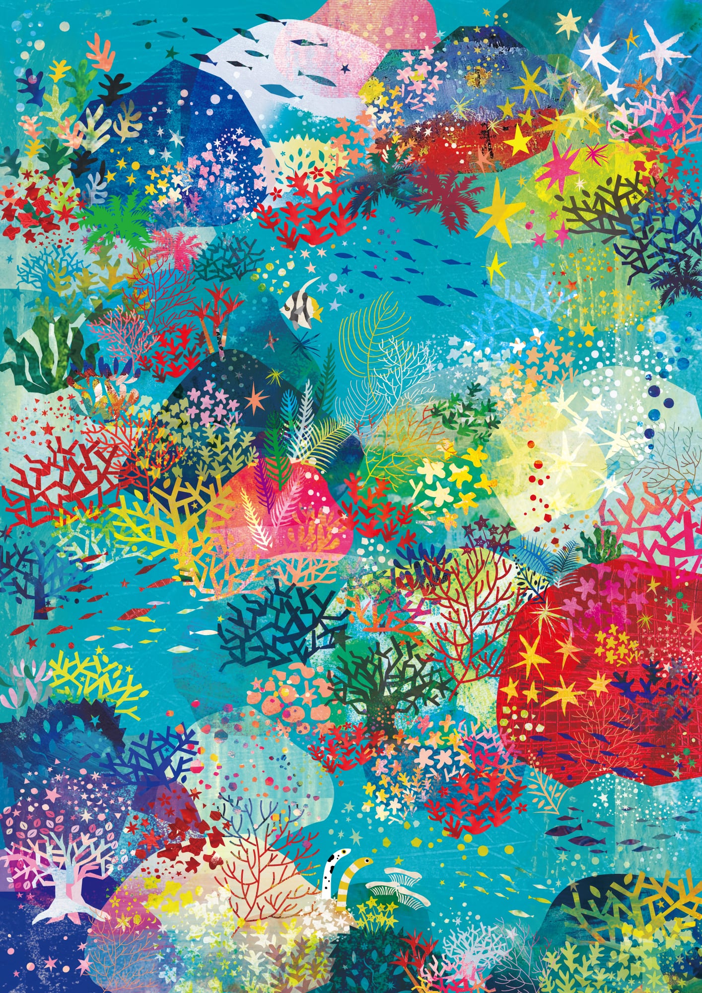 春、海、珊瑚をテーマに制作した空間デザインを そのままおうちで飾れる絵画に。 太子サイズ(287X378mm)の木製額縁に入った作品です。 ハル=春。 ウル=沖縄の言葉で珊瑚のこと。 春珊瑚は 水色と赤色の2種類。 こちらは水色です。 制作年:2026年 デジタル作品(絵の具を取り込みIllustratorソフト上で切り絵した作品) 高性能印刷で出力、サイン付き