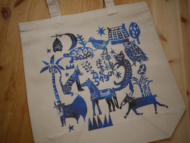 沖縄こどもの国にいる 沖縄の生き物をモチーフにしたシリーズのエコバッグ。 一点一点シルクスクリーンで刷っています。