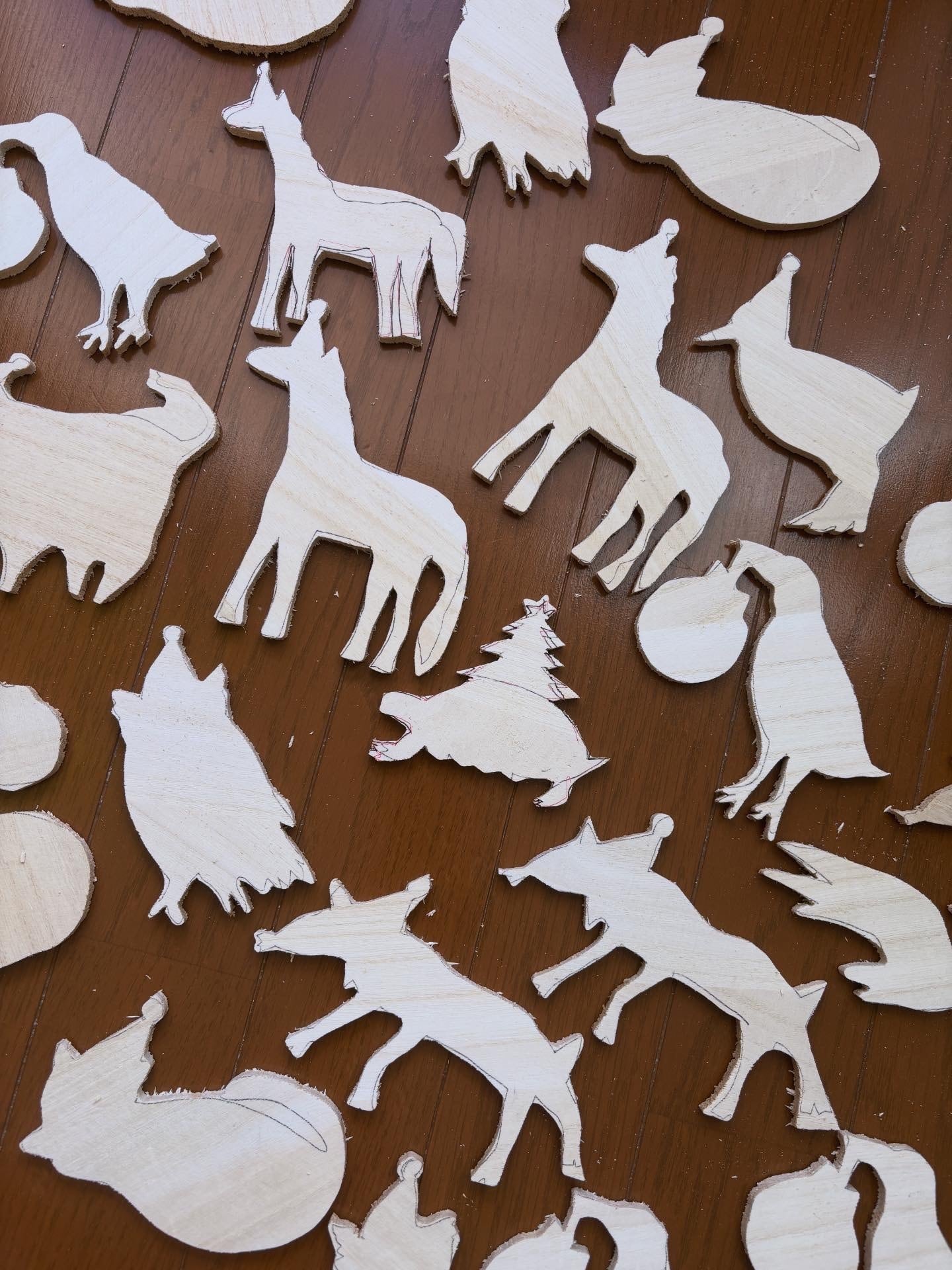 ヒノキのベニヤにアクリルガッシュ、水性ニス